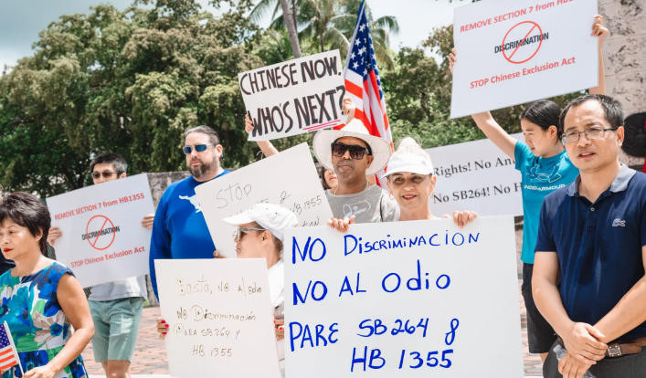 2023年4月,数十名华裔美国人抗议佛州禁令美媒